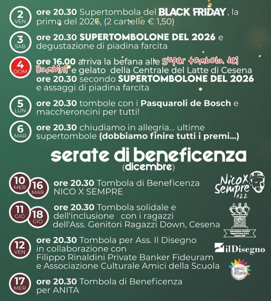 Anche quest’anno non mancheranno le tombole per grandi e piccoli, con ricchi premi in palio, sorprese speciali e un’atmosfera fatta di risate spontanee, giochi e calore autentico.