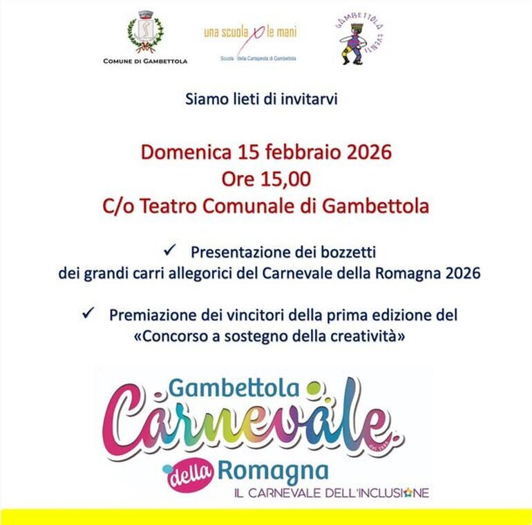 Il percorso si concluderà con la realizzazione di uno spettacolo originale dedicato alle storiche maschere del Carnevale di Gambettola: Gambino e Sgambetta, simboli di identità, ironia e tradizione. visualizza regolamento