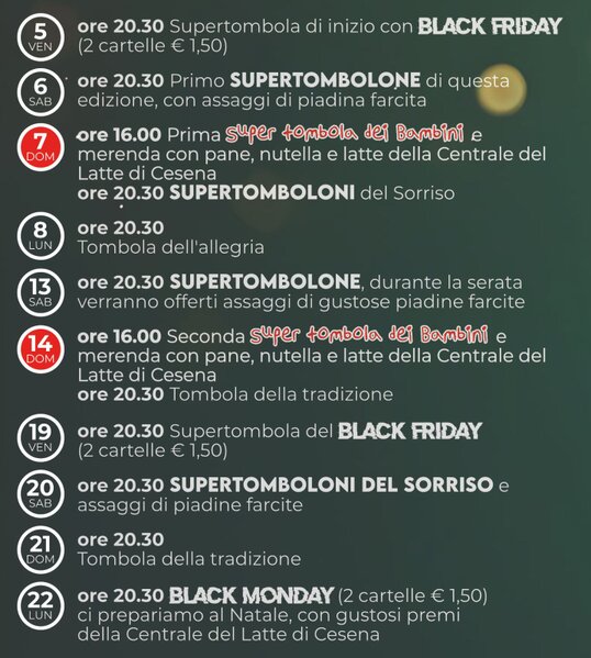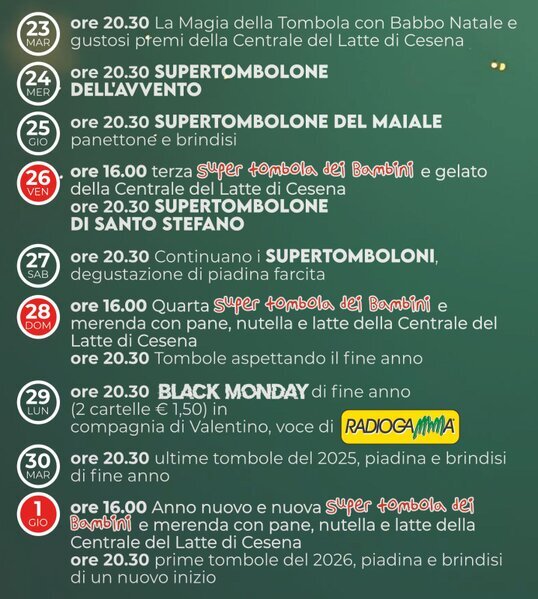 Anche quest’anno non mancheranno le tombole per grandi e piccoli, con ricchi premi in palio, sorprese speciali e un’atmosfera fatta di risate spontanee, giochi e calore autentico.